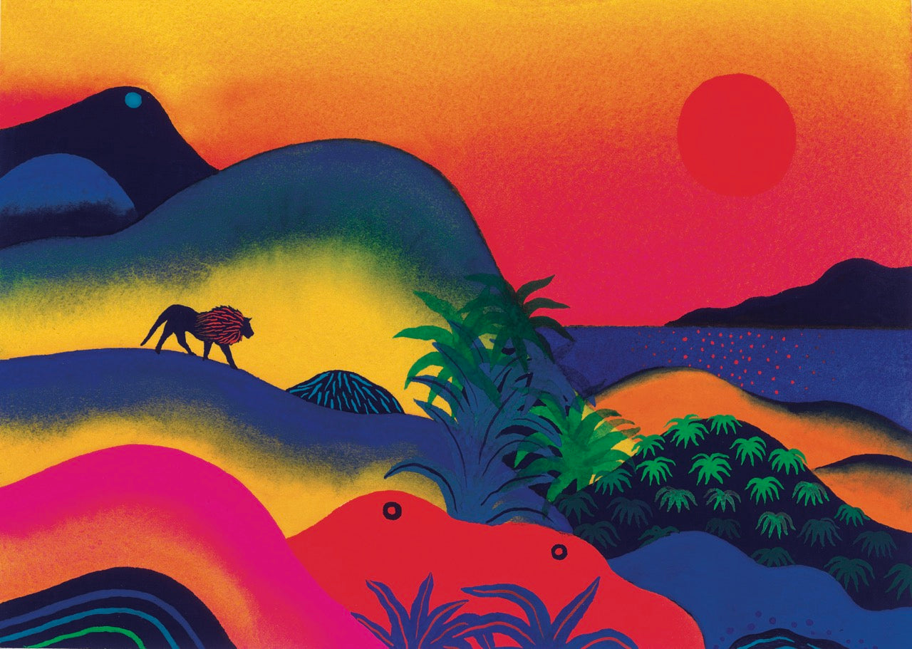 His talent as a storyteller of places was made for the scale of Iberian Leather: "I loved illustrating the book of the Iberian Leather perfume, which was intriguing to try to draw a smell. I looked at the colours the perfume evoked in me to create a chromatic range in my drawings. The strength of the perfume led me to deep colours, intense blacks, bright reds... I didn't know the Iberian peninsula well, so I used my imagination completely, creating a dreamlike space in which this big lion wanders."