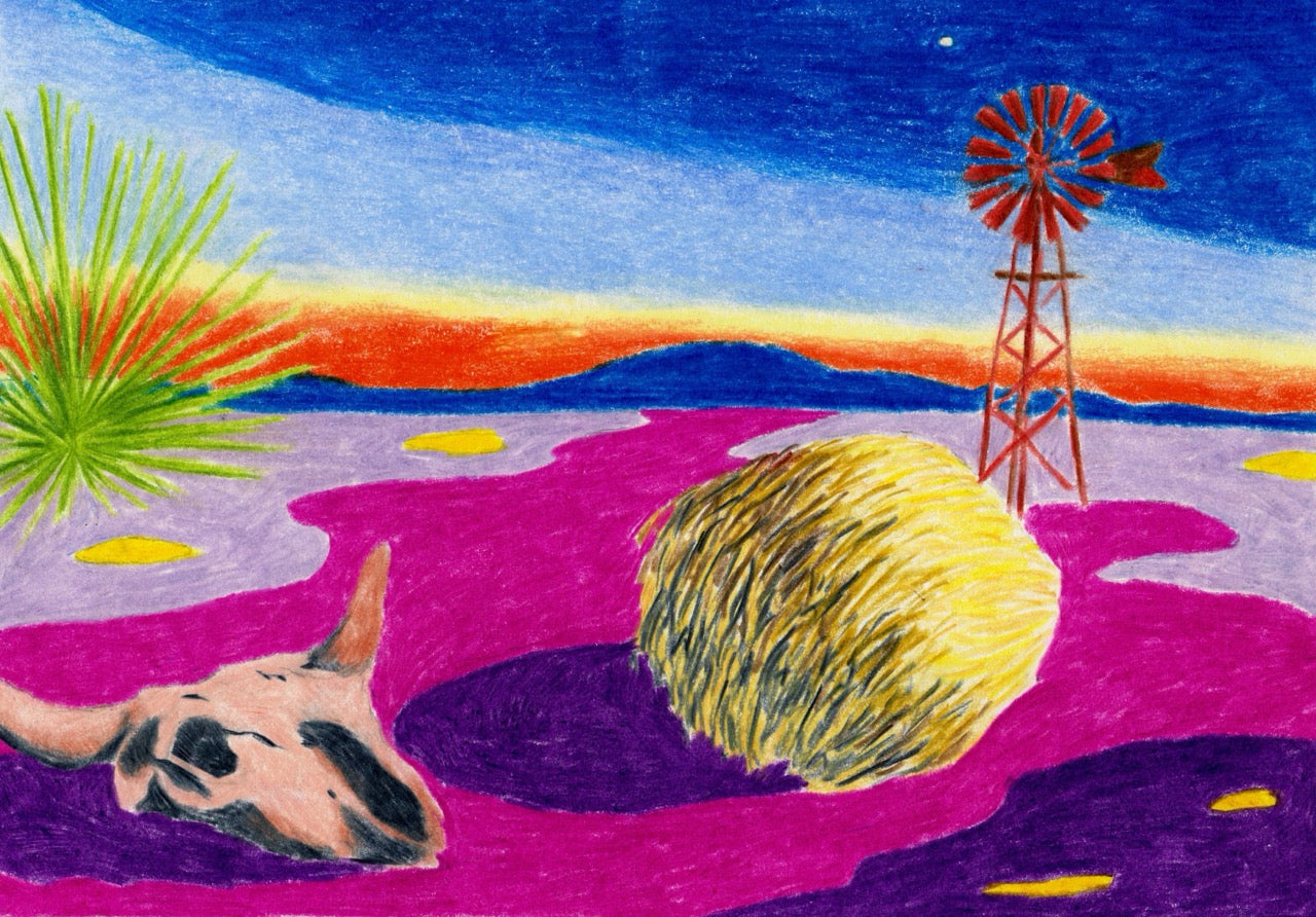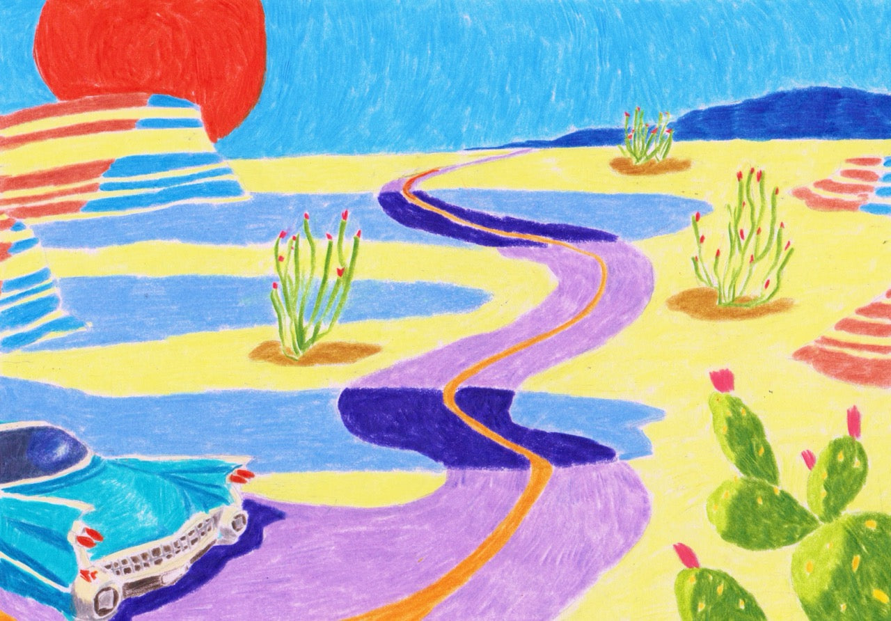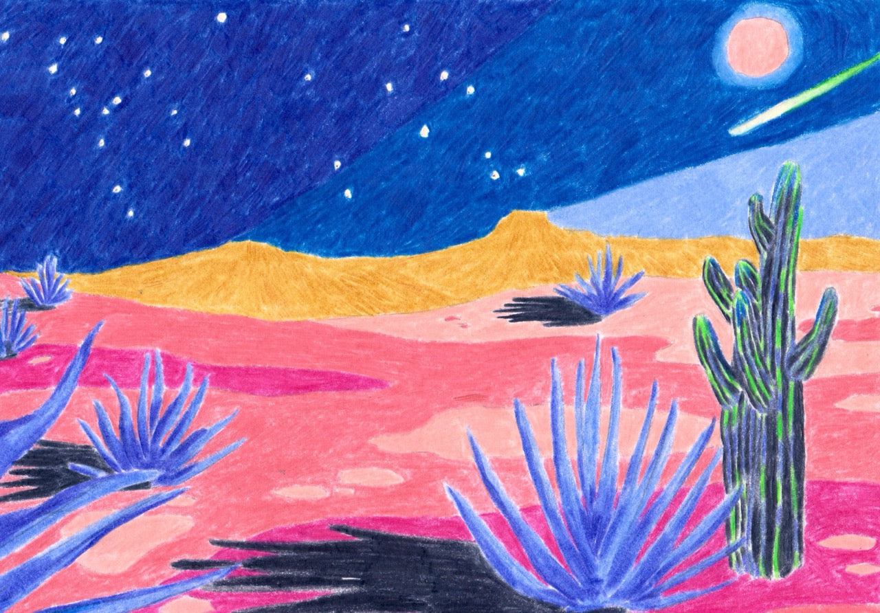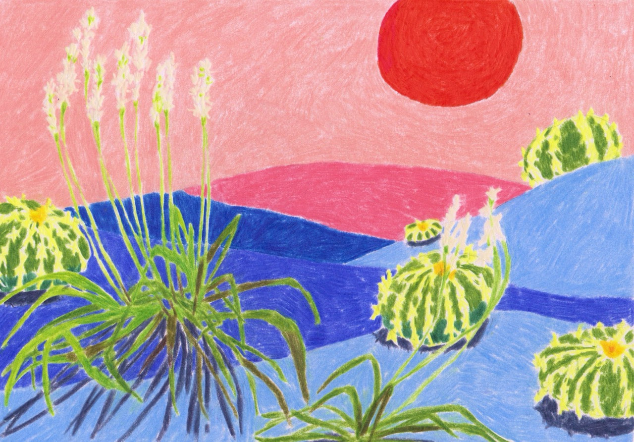 French artist born in 1987, she mainly draws landscapes with coloured pencils, from which emanates a form of intimacy, an inner mood. For Memo Paris, Kimiko imagined the setting of Marfa, a destination that particularly touches her: "For me, it is a place that reveals a cosmic aspect of our planet. A desert landscape where the colours finally have the amplitude to fade almost to infinity... There is little to stop them apart from a few cacti. It was a real challenge to detach myself from the real gradients of the Marfa sky and land and still try to convey its surprising beauty. Almost all my drawings start with a landscape: the more distant, the more exciting. That's why I was delighted to create the graphic universe of this perfume.